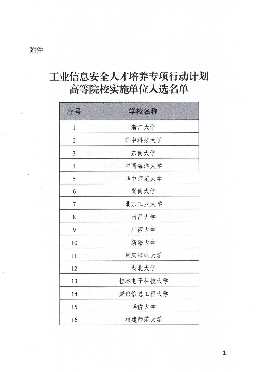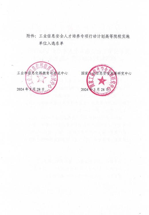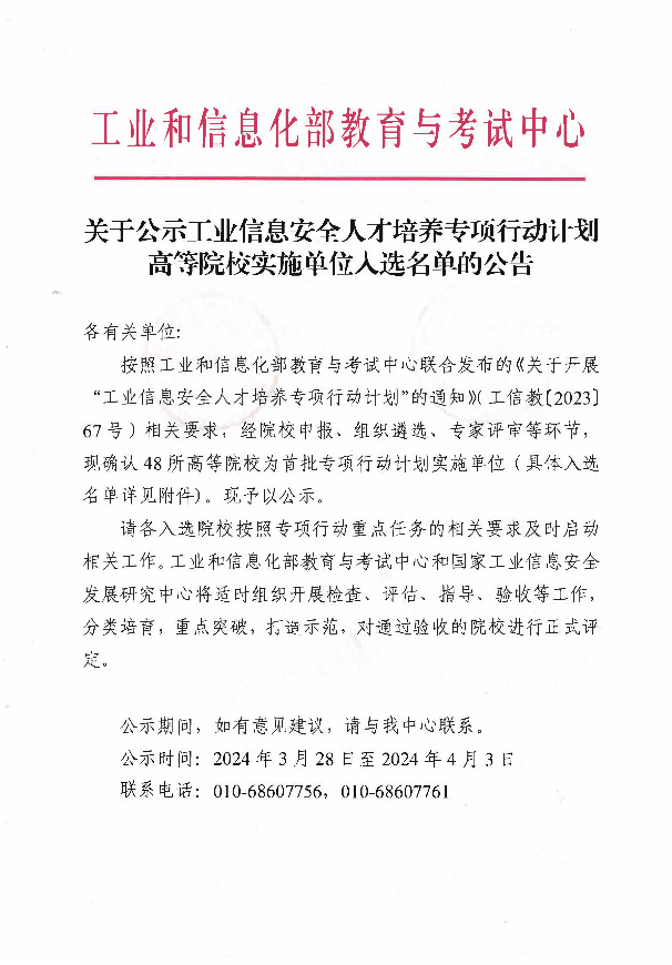 2024年3月,工业和信息化部教育与考试中心发布《关于公示工业信息安全人才培养专项行动计划高等院校实施单位入选名单的公告》。按照工业和信息化部教育与考试中心联合发布的《关于开展“工业信息安全人才培养专项行动计划”的通知》(工信教〔2023〕67号)相关要求,经院校申报、组织遴选、专家评审等环节,确认48所高等院校为首批专项行动计划实施单位。