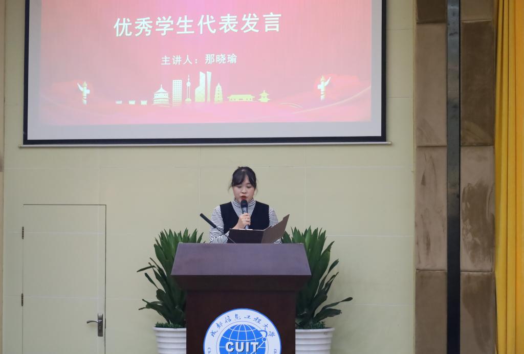 随后各学生代表发言:18级优秀学生代表唐浩哲、那晓瑜给学弟学妹们的大学生活提出建议,希望学弟学妹可以有一个清晰的目标,自我控制,自我管理;21级新生代表来赵翊茗、邬清云发言,坚定新生将“成于大气、信达天下”的校训铭记于心的态度。