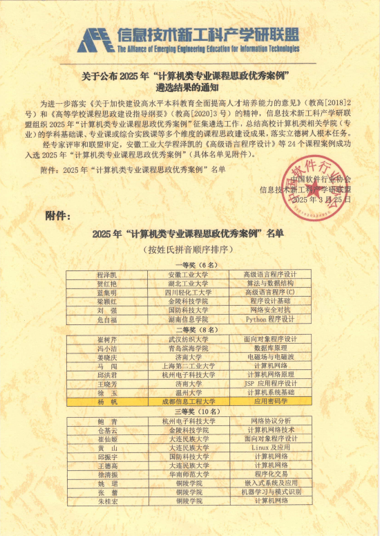 三位教师还参加了首届计算机类专业课程思政建设教学研讨会。作为会议重要成果,2025年度“计算机类专业课程思政建设优秀案例”评选结果同期揭晓,泡芙短视频