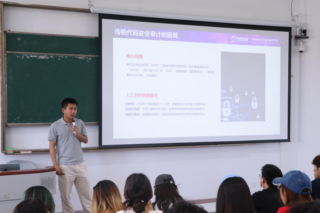 讲座现场,邓胜科分享对“网络安全技术应用实践”的深刻见解;周文宝聚焦“网络安全人才方向选择”讲解实战型网络安全人才培养的理念;钱滔介绍大模型的发展和应用,重点分析安全风险及治理措施;吴元祥对大学生网络安全职业新认知和当前就业形势进行阐述,为大学生就业准备提供思路;陆克司则带来“密态数据库技术的兴起由来”主题分享。