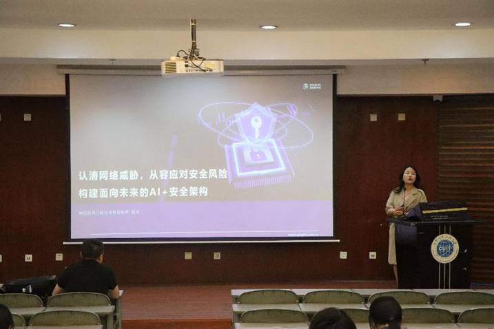 在国际会议厅,喻晓玲带来“安全事业,大有可为”的主题演讲,她剖析了网络安全行业的现状与发展前景,介绍了绿盟科技在安全研究、产品体系、人才培养等方面的举措。陈澜以“大学生职业生涯规划”为主题,从自我认知、职业定位到发展路径选择,为同学们提供了清晰的职业规划思路。周松柏围绕内生安全的政策要求、技术特性及海光在该领域的探索实践,带来“内生安全·从“芯”开始“的演讲。