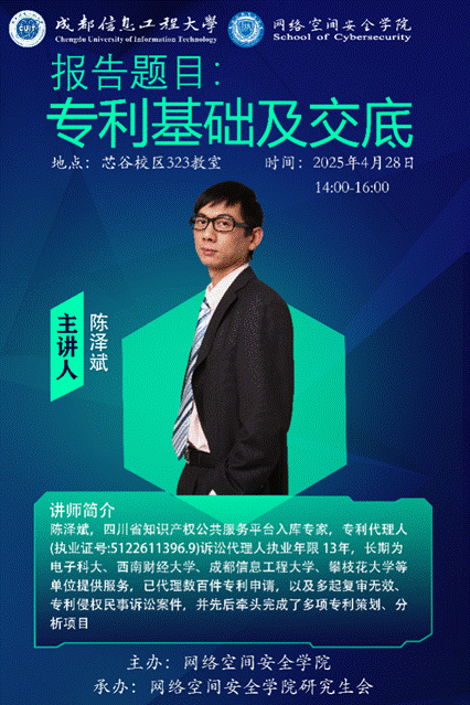 师生作《专利基础及交底》专题讲座。讲座在芯谷323会议室举行,由网络空间安全系主任彭承宗教授主持,讲座吸引了众多师生参与。