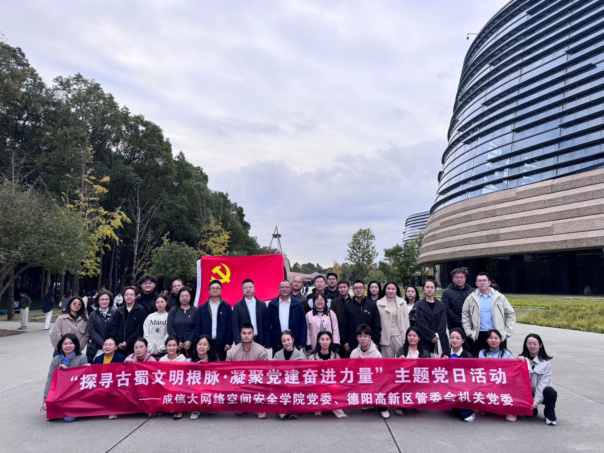 党委与德阳高新区管委会机关党委联合开展“探寻古蜀文明根脉·凝聚党建奋进力量”主题党日活动,学院组织党员教师走进德阳三星湖与三星堆博物馆,在历史与现实的交融中汲取精神力量。