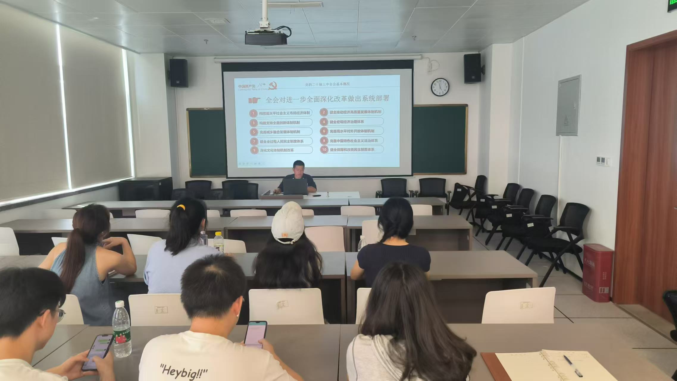 会议第一项,由专硕2023级党小组组长路承信同志带领大家学习二十届三中全会精神。全会强调了教育、科技、人才是中国式现代化的基础性、战略性支撑,提出构建支持全面创新体制机制。必须不断完善科技创新组织方式和治理体系,加强科技创新全链条部署、全领域布局,努力破解原始创新能力相对薄弱、关键核心技术受制于人等突出问题,加快实现高水平科技自立自强。