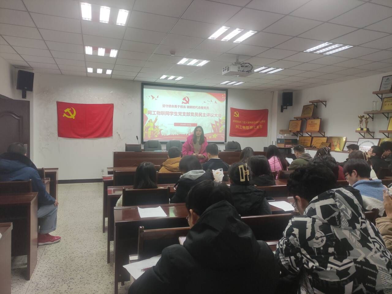 会议第二项,支部书记总结支部一年来工作情况,网工物联网学生党支部书记何佩遥同志总结2023年年度本支部工作的开展情况。就一年来党支部开展的各项活动情况进行了总结,介绍了2023年度党支部发展新党员情况,通报了党支部存在的问题,指出了支部工作的不足,针对2024年度支部的会议出席情况给出一系列希望和要求,完善支部会议的请假条例。