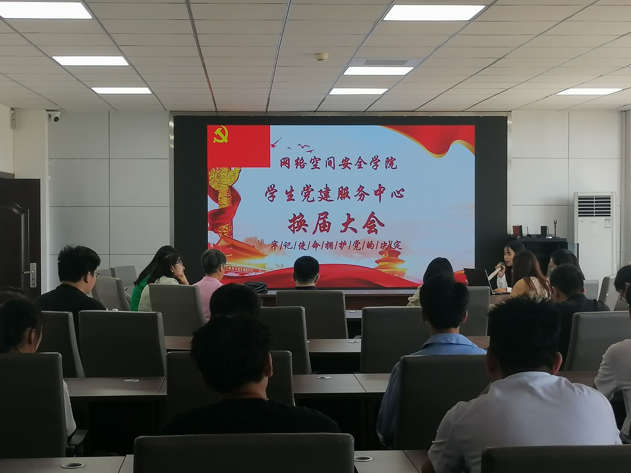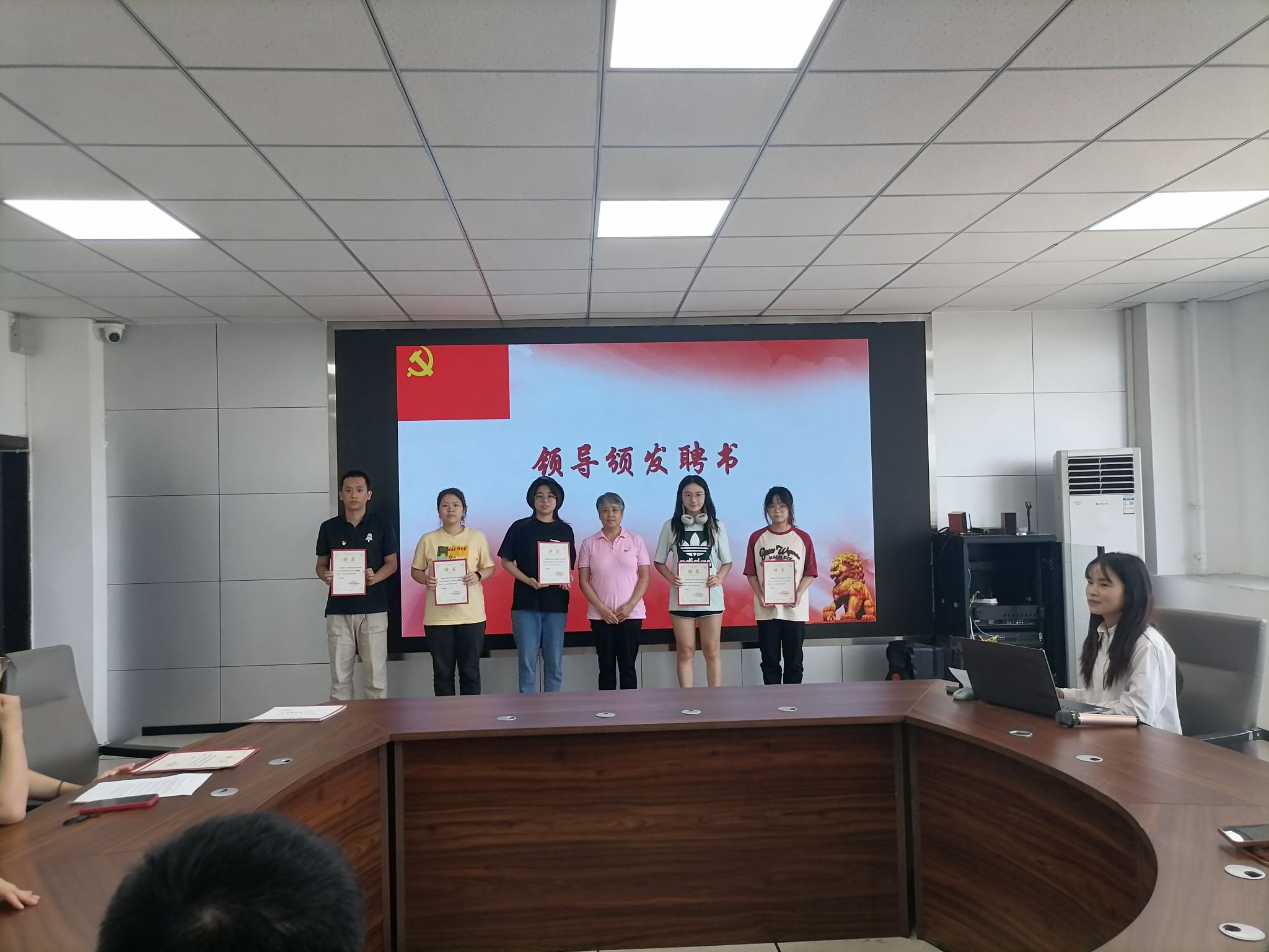 在会议中,参会的领导老师为往届的党建服务中心成员颁发了聘书,对他们在过去一年的付出与贡献表示肯定。同时也宣布了新一届党建服务中心各部门负责人的名单,希望他们能像往届的部门负责人一样,担负起身上的责任,带领整个团队开拓进取,积极为同学们服务。