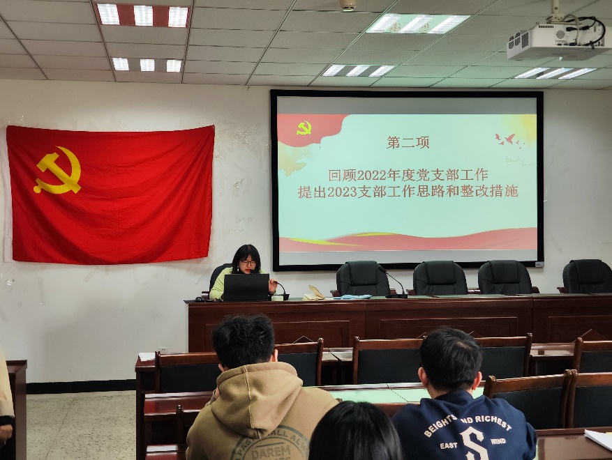 随后,党支部书记姜艳代表党支部委员会报告工作,回顾了研究生党支部2022年建设情况,通报党支部委员会查摆问题等方面情况,接受党员评议,全面查找存在的问题与不足,并提出2023年党支部工作思路及整改措施。