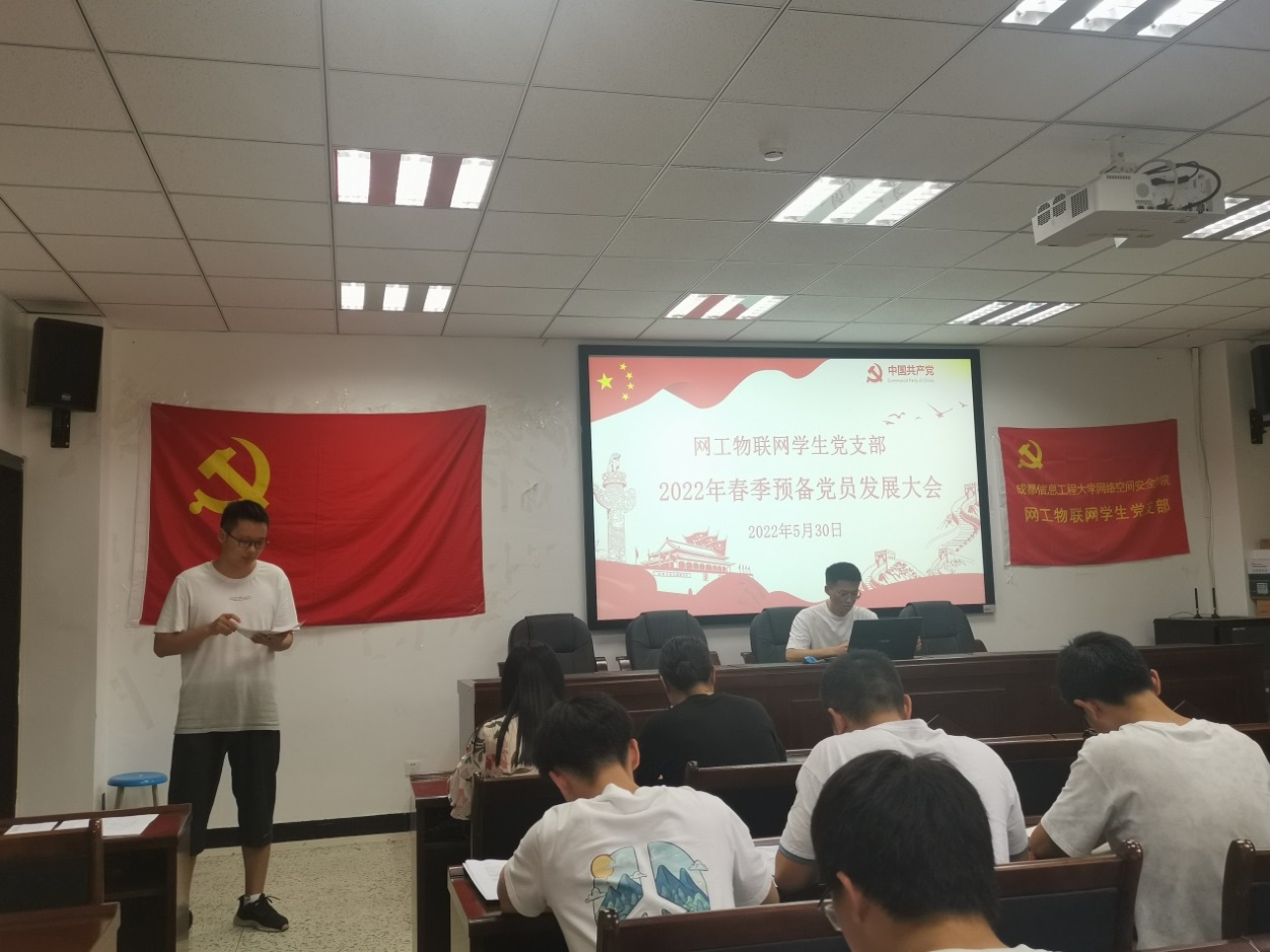 网工物联网学生党支部预备党员发展大会在双中心A402顺利召开。参加本次会议的有网工物联网学生党支部书记何佩遥、全体学生党员和12名发展对象。本次会议由党支部书记何佩遥主持。