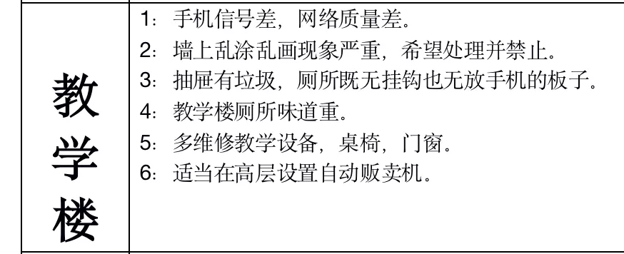 (一)食堂卫生问题问题反映:食堂桌面收拾不及时,较肮脏,地板有油,容易绊倒。解决情况:食堂经理将会在开会给保洁阿姨细致分工,如有同学发现以上问题也可以提醒阿姨及时处理哦。