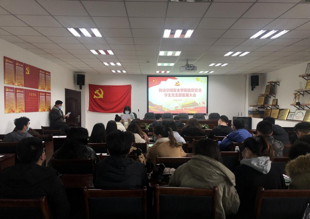 信息安全学生党支部在双中心A402成功召开党员发展大会,会议主要内容是讨论关于接受杨媛等27位同志为预备党员的问题。此次会议由支部组织委员李澎主持,支部书记姜艳老师、支部党员和杨媛等27名发展对象参加。