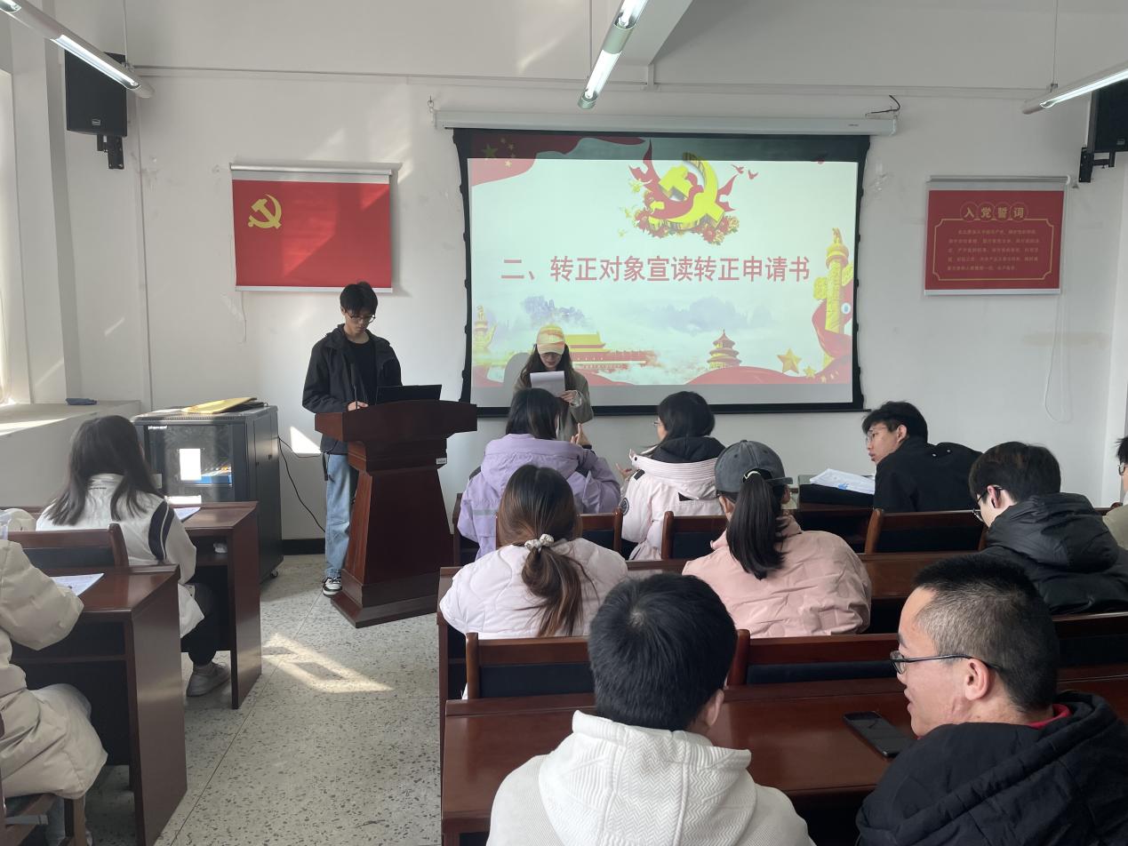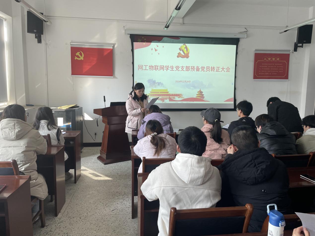 网工物联网学生党支部在信达楼C405召开预备党员转正大会。会议由党支部书记赵丹主持,全体党员参加。