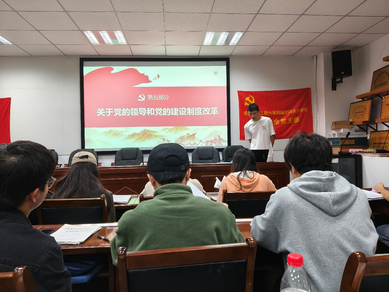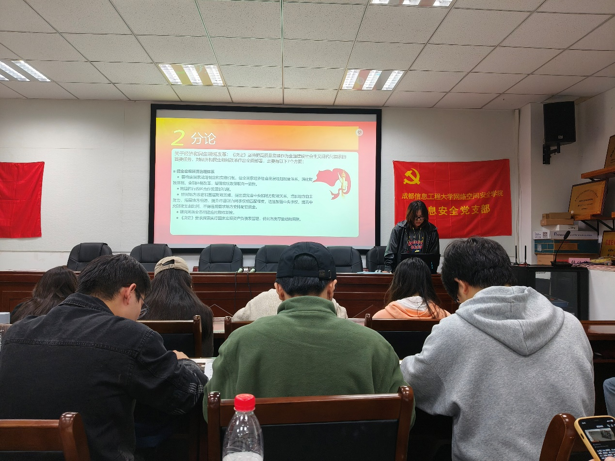 信安网安学生党支部在信达楼A402举办了以“党的二十届三中全会会议精神学习分享”为主题的组织生活会。本次会议由党支部副书记朱海鹏主持,全体党员积极参与。