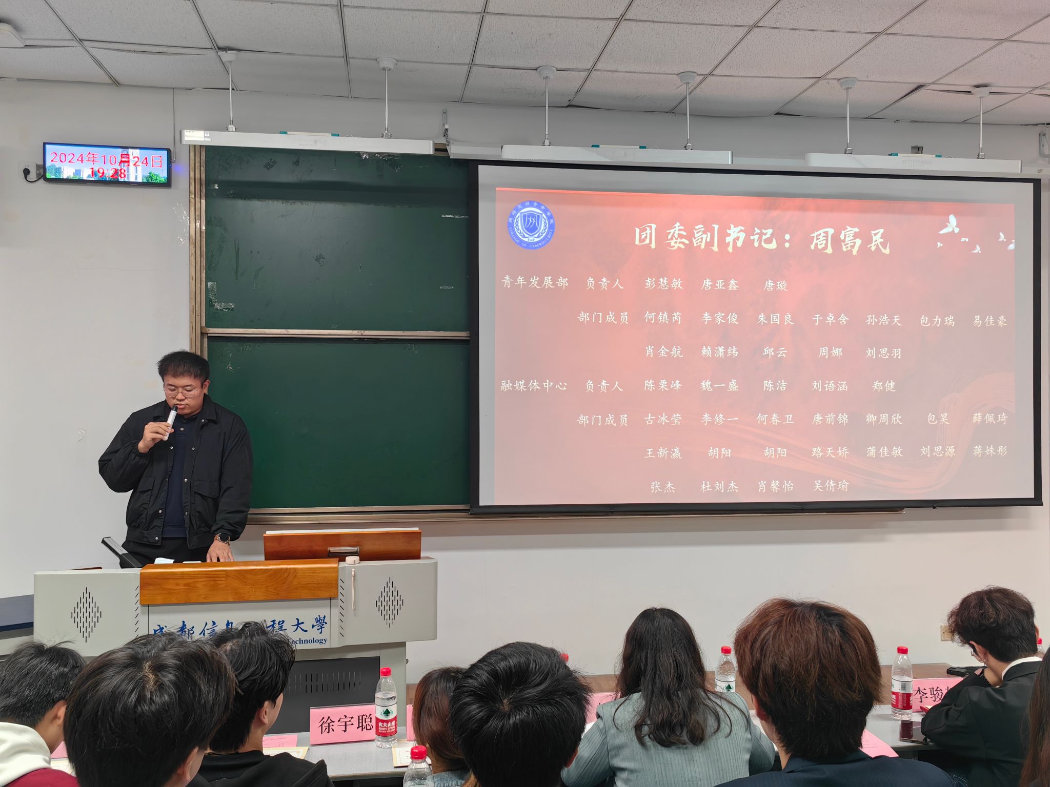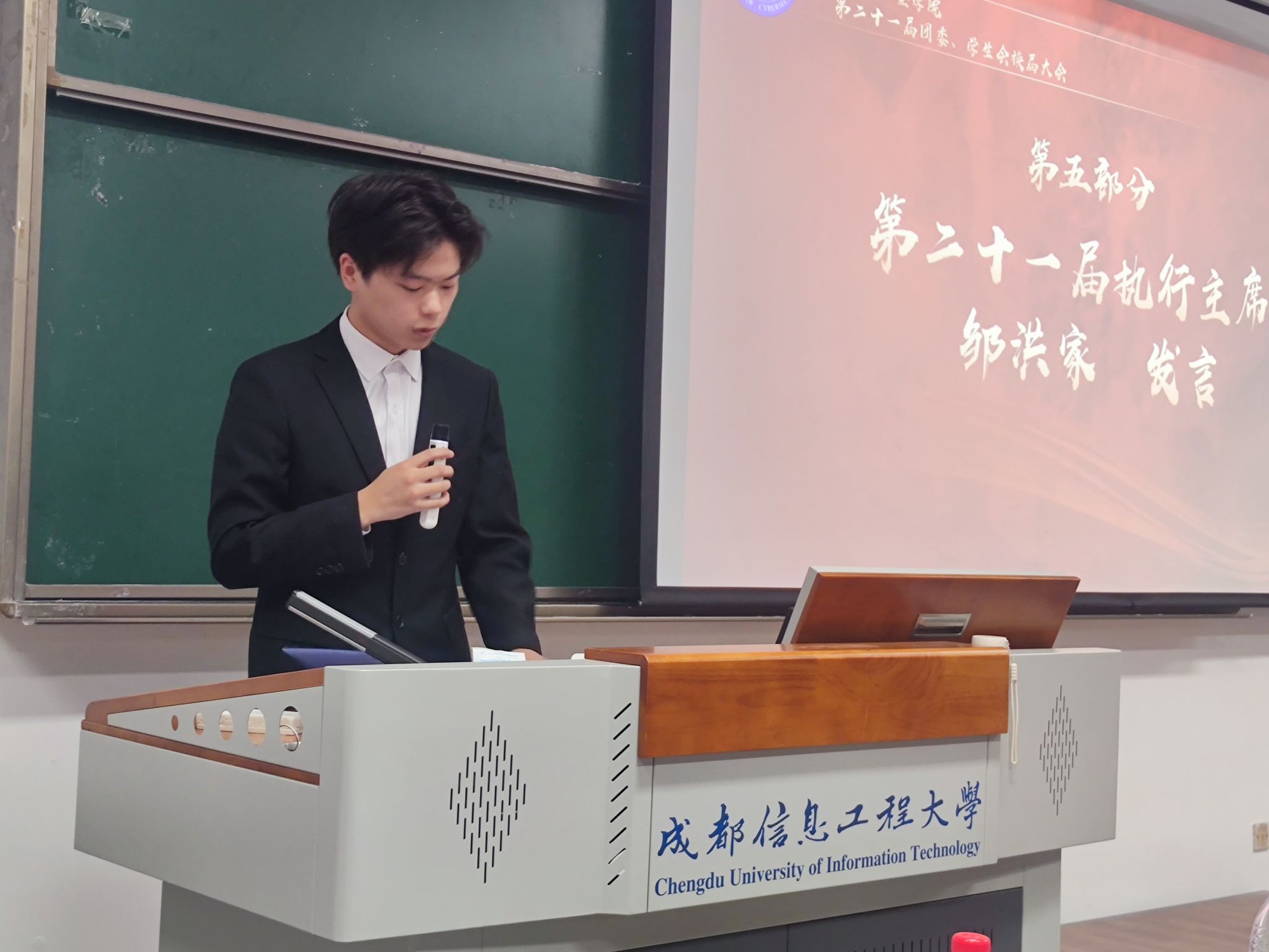 随后,第二十一届学生会执行主席邹洪家进行发言。他强调,团委学生会是学生自我管理、自我服务、自我教育的重要平台,希望所有成员加强团队协作,提升综合素质,助力学校发展。同时对新成员提出了三点要求:服务同学、发挥模范带头作用;培养领导才能和团队意识;尊重和沟通。此外,他还强调了创新的重要性。