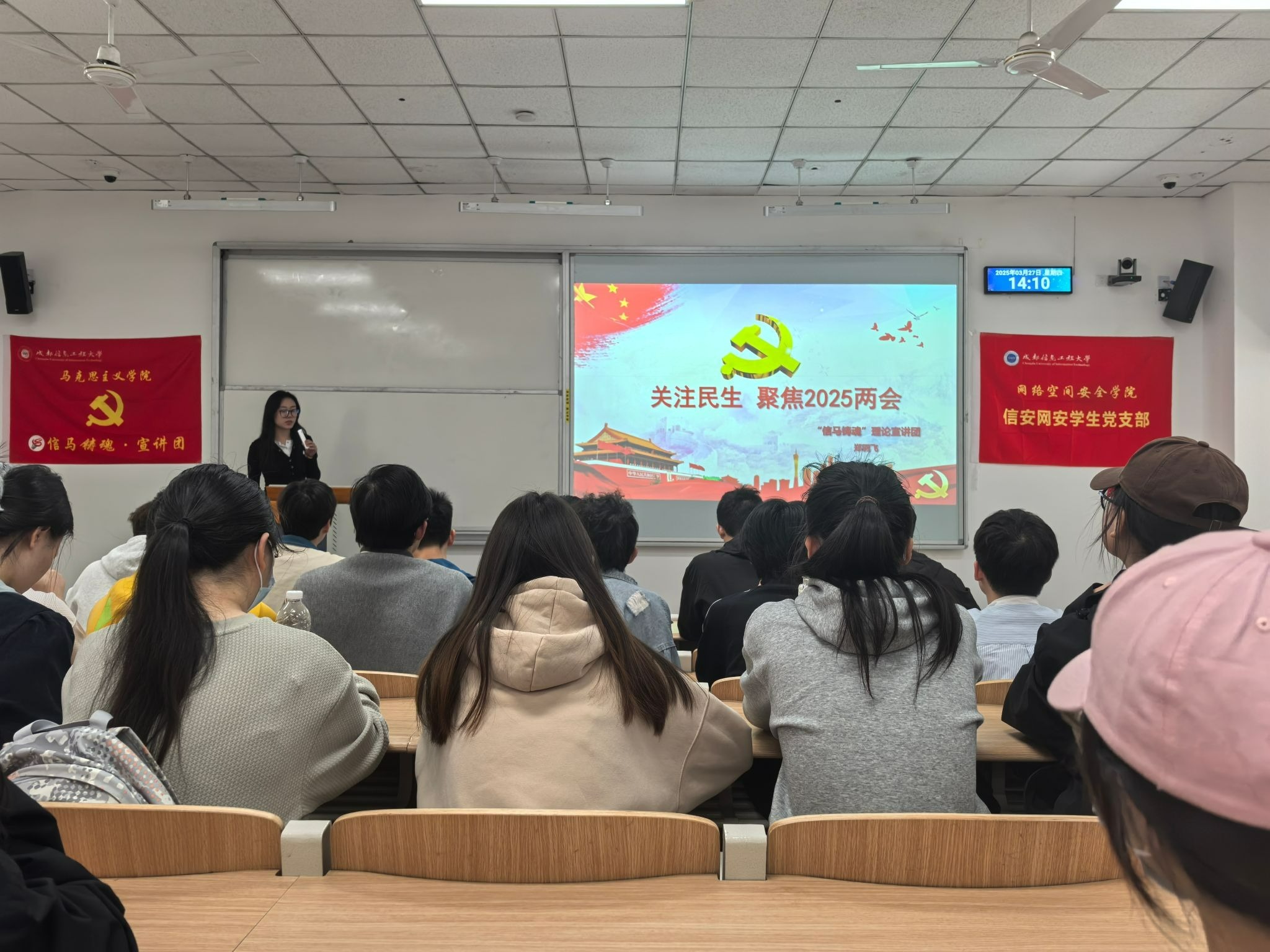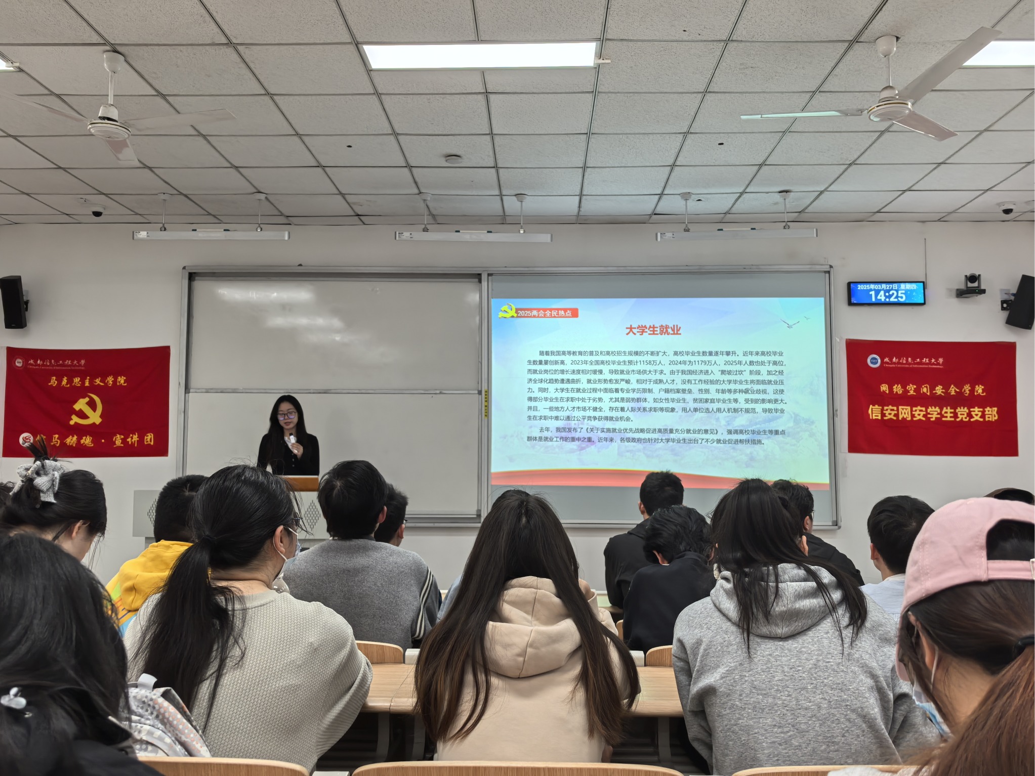 会议第一阶段,来自“信马铸魂”宣讲团的郑羽飞同学作专题辅导。宣讲团带领党员同志们全面回顾了2024年国家在经济发展、社会建设、科技创新等多领域取得的成绩,让党员们深刻认识到过往一年奋斗的不易与成果的丰硕。同时,详细讲解了2025年国家及地方的发展目标,涵盖经济增速预期、产业结构优化方向、民生改善重点任务等内容。在对2025年两会全民热点解读环节,针对“体重管理”相关话题,剖析了其背后反映出的国民对健康生活方式关注度提升,以及对公共健康服务体系完善的期待;围绕“大学生就业”热点,从就业形势、政策扶持、职业规划等角度展开阐述,引导党员大学生提前做好应对,积极投身就业创业实践,为社会发展贡献力量。