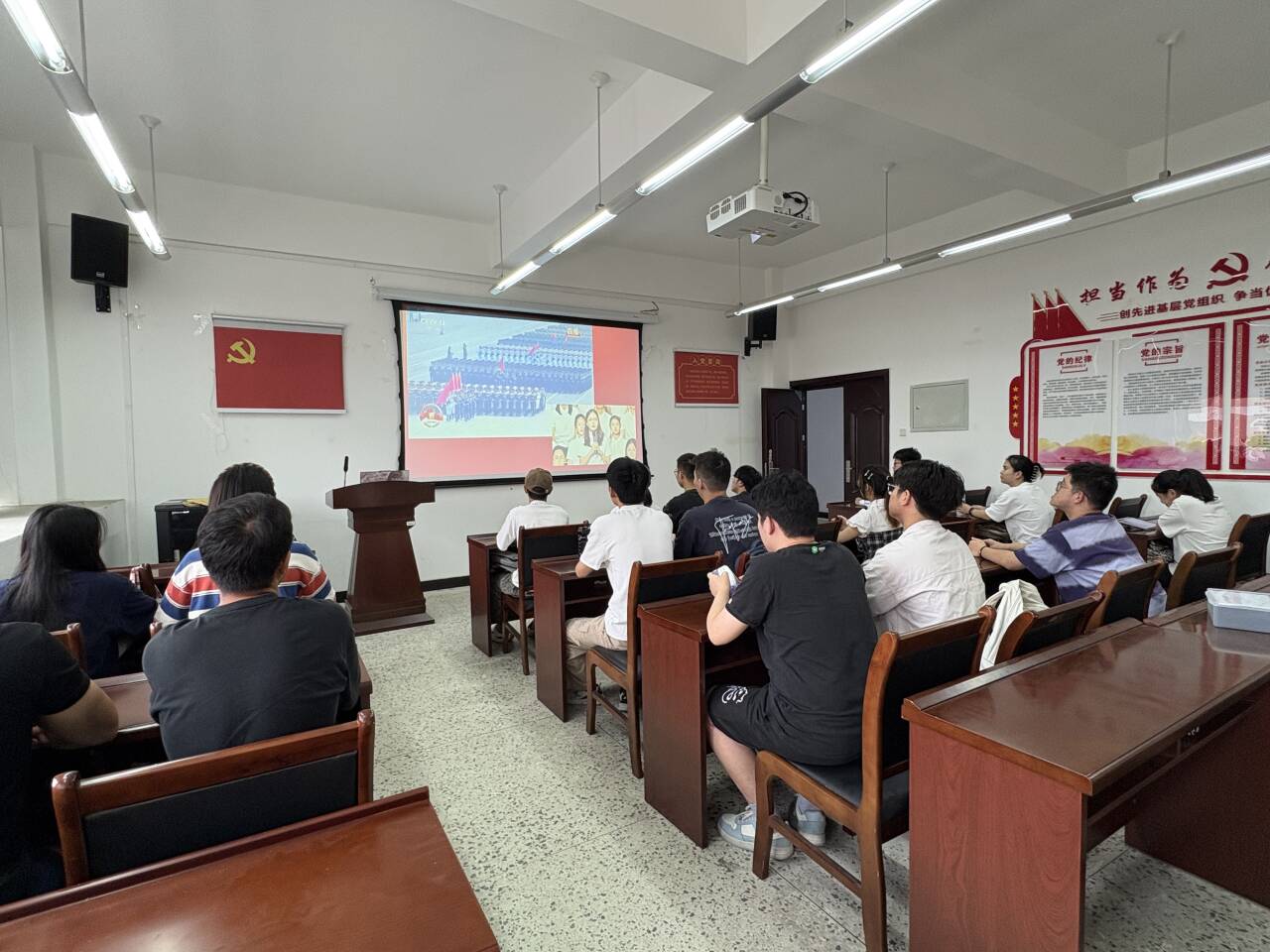 网工物联网学生党支部在C405会议室组织全体党员集体收看“弘扬伟大抗战精神 做光荣自豪中国人——纪念中国人民抗日战争暨世界反法西斯战争胜利80周年”全国大中小学生思政大课直播,并开展专题学习交流。支部书记张琴、全体党员参加活动。