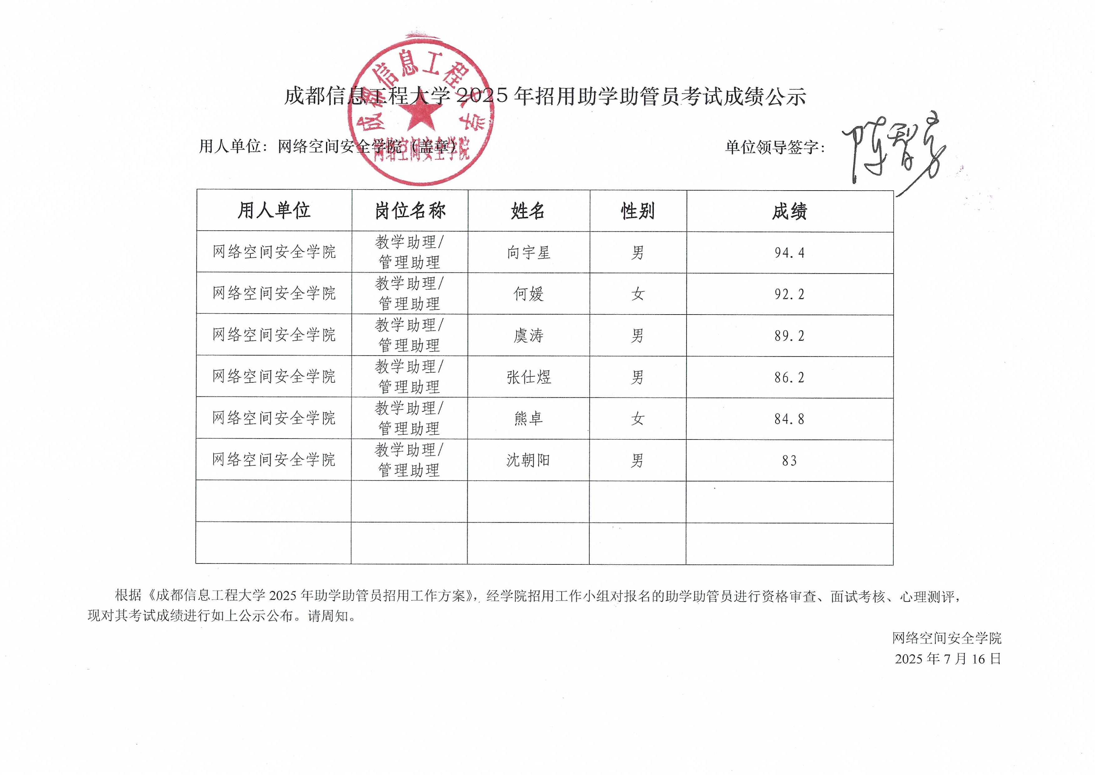 根据《泡芙短视频 2025年助学助管员招用工作方案》,经学院招用工作小组对报名的助学助管员进行资格审查、面试考核、心理测评,现对其考试成绩进行如下公示公布。