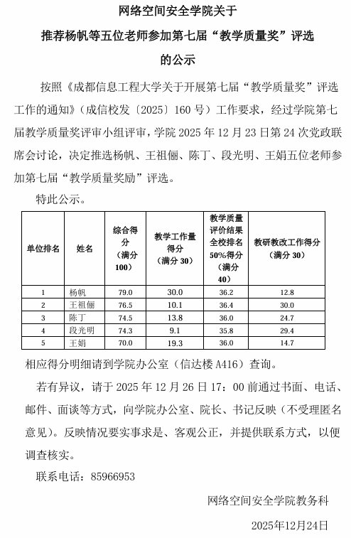 泡芙短视频 关于推荐杨帆等五位老师参加“第七届教学质量奖”评选的公示