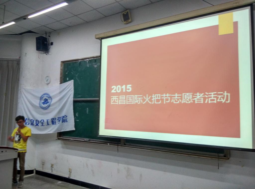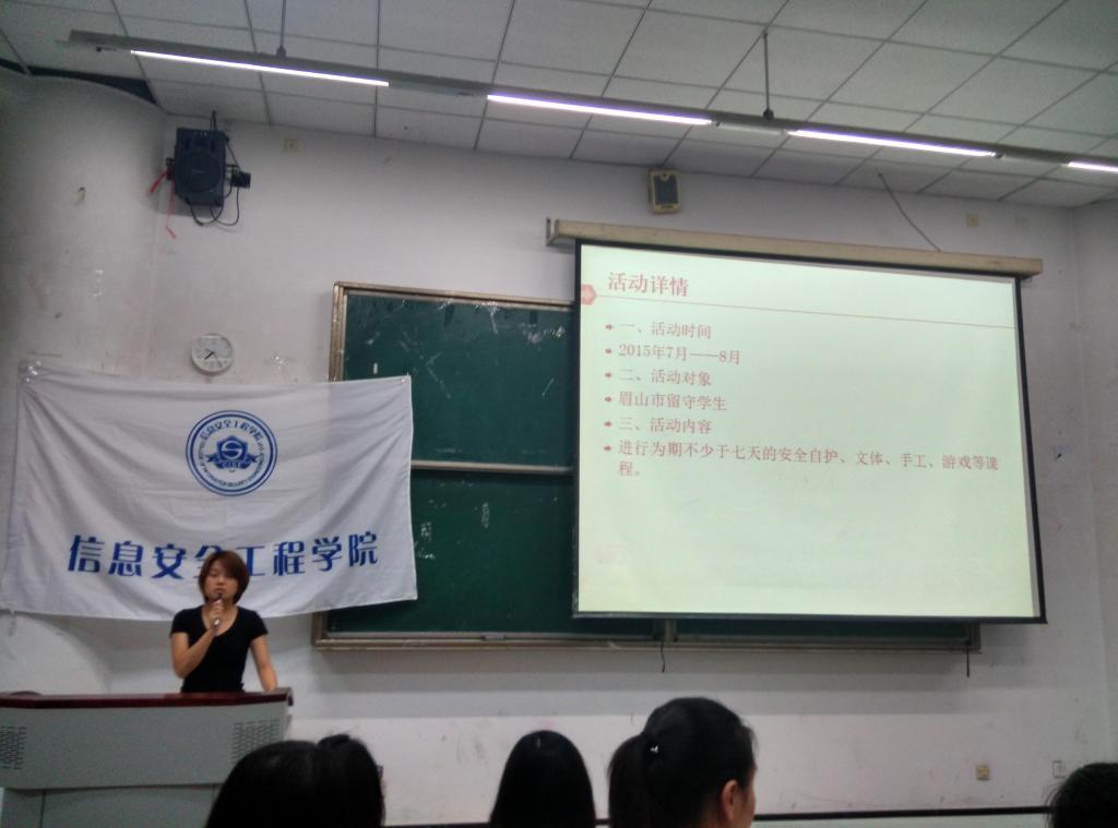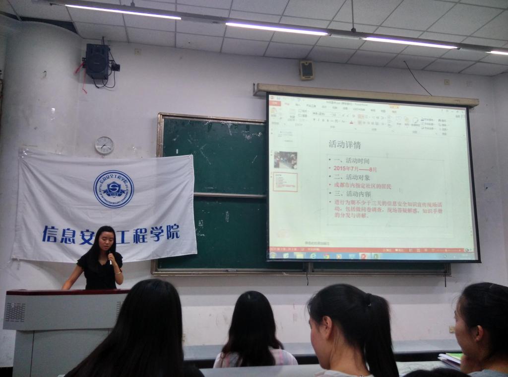 615日晚上19004313教室,信息安全工程学院举办了2015大学生志愿者暑期三下乡社会实践活动动员大会。出席此次活动的有信息安全工程学院分团委书记贾茜老师,学生会何佩遥老师,信息安全工程学院分团委学生会全体成员及对本次活动感兴趣的各年级同学。