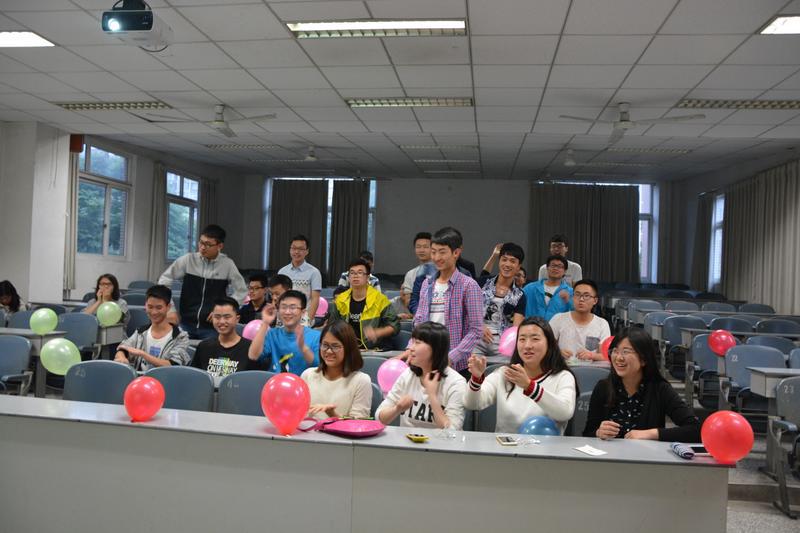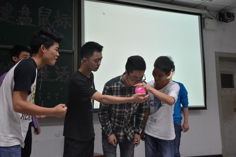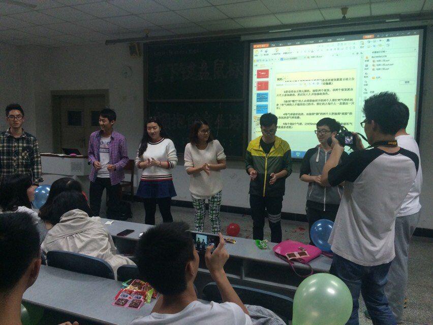 班会共分为微电影播放和游戏两个环节。微电影由班上同学友情参演,讲述一个只知道游戏的男生,走出寝室,成为“高富帅”的故事,同学们看完后感触颇深,反响热烈。在游戏环节中,同学们积极参与其中,为各自所在寝室挣得积分。