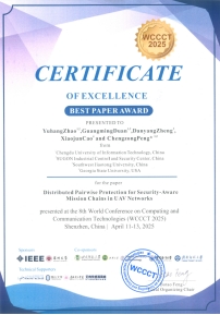 为第一单位,先进微处理器技术国家工程研究中心(工业控制与安全分中心)为第二单位,以“Distributed Pairwise Protection for Security-Aware Mission Chains in UAV Networks”为题获得最佳论文奖励。该论文针对无人机自组网中安全感知任务链的动态性和资源约束难题,提出了一种创新的分布式成对备份防御优化算法。该算法融合安全资源效能比与结对备份选择技术,有效平衡安全需求与资源效率,显著提升任务链的可靠性。论文由彭承宗副教授指导。