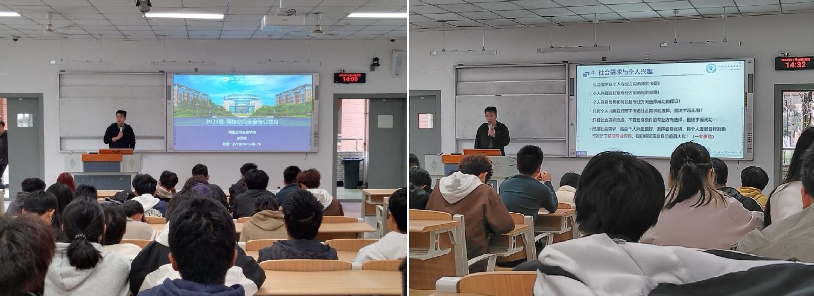 在航空港校区1108教室对2024级网络空间安全专业全体新生进行了专业教育,由彭承宗副教授主讲,罗杰博士出席会议。
