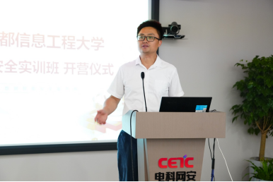 开班仪式上,电科网安公司总经理助理陈澜发表了关于电科网安开展校企合作工作情况的讲话,强调了产教融合的重要性和必要性。电科网安安全服务事业部介绍了为这次实训精心策划开发的专业课程和实训课题。安服事业部还结合网络安全热点事件给同学们研究课题,采用启发式、探究式的教学方式加深同学对网络安全专业的认知。