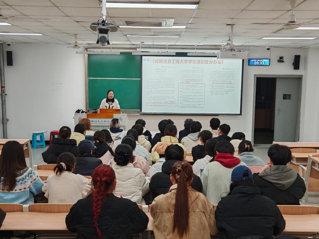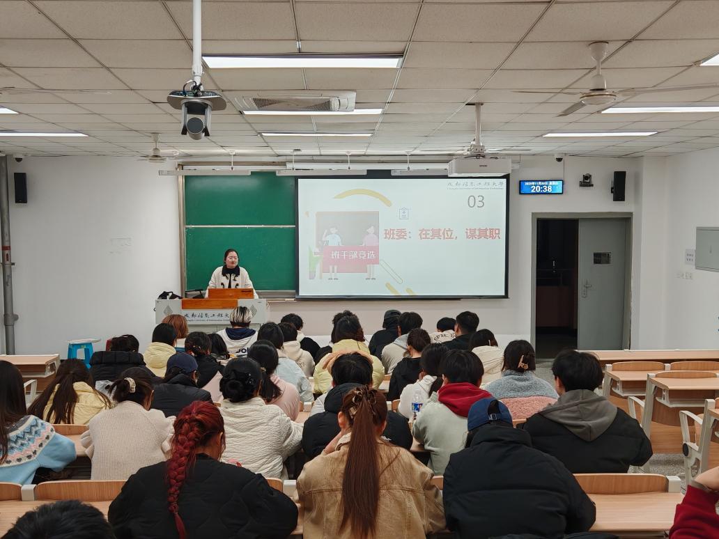 为加强班级学风建设,筑牢校园安全防线,发挥班委骨干带头作用,2025年11月20日晚20:30,2024级网络工程与网络空间安全专业学生在H2204教室召开“诚信考试、高效学习、安全护航”主题班会。会议由辅导员韩阳主持。