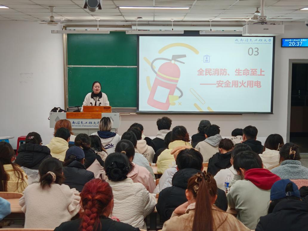 在安全教育环节,韩阳以“全民消防、生命至上——安全用火用电”为主题,结合宿舍检查情况,指出违规用电隐患,讲解安全用电规范与应急处置方法。防范电信网络诈骗部分,系统介绍了电信诈骗的定义、新形势下的演变趋势、常见诈骗手法及防范措施,并明确遭遇诈骗后的应急处理方式,提醒同学们增强防范意识,不轻信、不转账、及时求助。