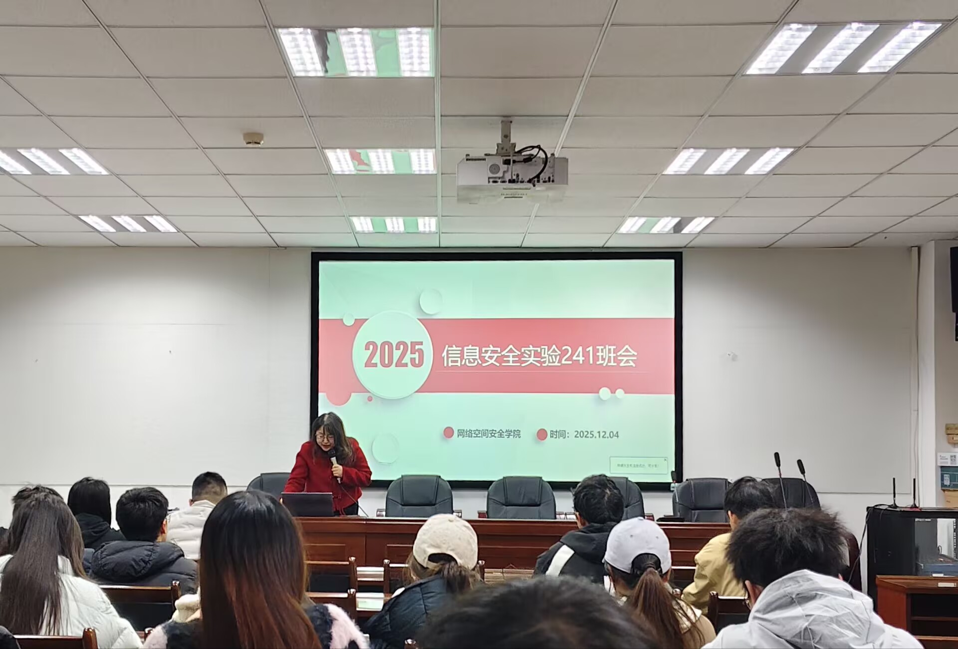 信息安全实验241班班会于12月4日在信达楼A402顺利召开。本次班会由实验班辅导员姜艳老师主持,特邀两位专业班导师——白杨副教授、李沁东博士出席,实验班全体同学参加。