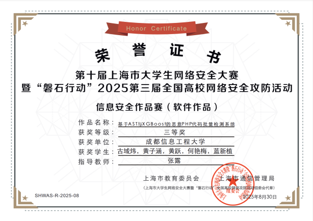第十届上海市大学生网络安全大赛暨“磐石行动”2025全国高校网络安全攻防活动三等奖