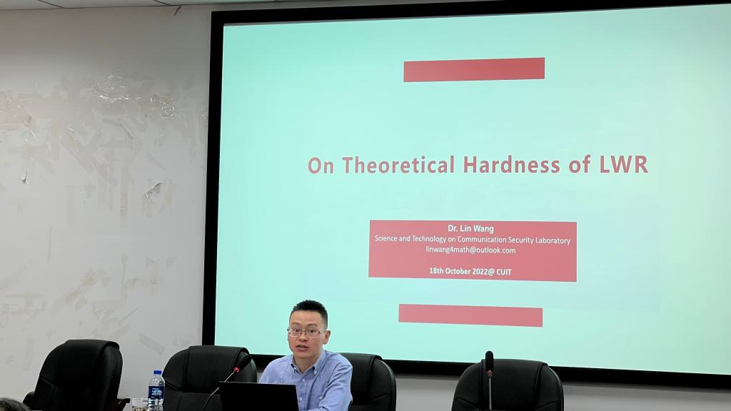 最后,王林高级工程师作出题为On Theoretical Hardness of LWR的报告。他简洁明了地讲述了抗量子密码算法的设计及原理,有效推动了同学们对量子密码的进一步认识。