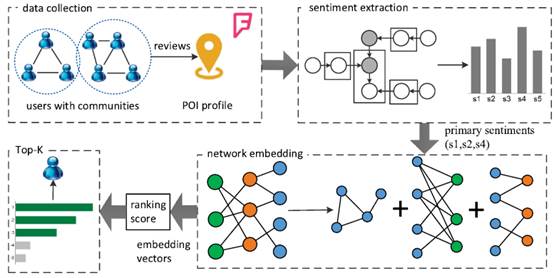 LBSN将人们的线上生活和现实生活联系起来。兴趣点推荐作为LBSN的一种重要应用,可以帮助用户发现感兴趣的餐厅、咖啡厅、书店等兴趣点。除了数据稀疏和冷启动之外,兴趣点推荐还有两个问题严重影响了推荐的准确度,一个是文字蕴含的不同类型情感之间的模糊界线,另一个则是相似度度量引起数据质量降低。该成果搭建了基于社区结构的情绪抽取方法与基于网络嵌入的兴趣点推荐框架,率先利用概率图模型获取到LBSN评论文本中的情感,采用网络表示学习的方法获得兴趣点、用户和文本情感的低维向量,针对异构信息网络中的所有连边进行交替采样。在两个真实数据集上的实验表明,该成果用于真实场景下兴趣点推荐时具有明显的优势。