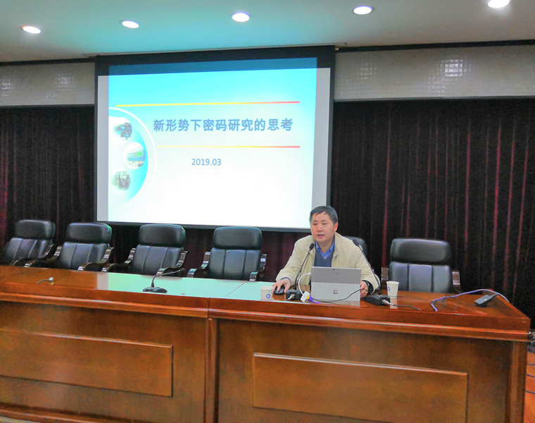 名誉院长、中国科学院院士,信息分析专家,解放军保密委员会技术安全研究所研究员郑建华,在行政楼一楼会议室为全校师生做了一场题为“新形势下密码研究的思考”的学术报告。会议室济济一堂,会场气氛热烈。