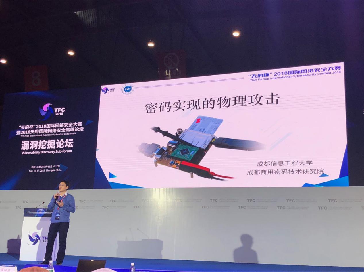 副教授、成都商用密码技术研究院院长吴震作为密码学专家应邀参加会议,并在漏洞挖掘论坛进行了主题为“密码实现的物理攻击”专题演讲。他从密码算法、现实、安全和针对密码现实的攻击实例与被动攻击等方面,对密码实现的物理攻击做了全面分析,并指出了一些关于密码安全性的探索方向。