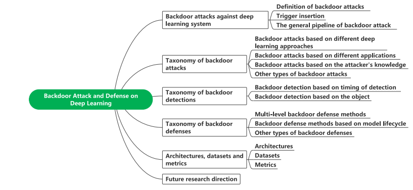 论文对当前在深度学习领域中所研究的后门攻击、检测及防御方法进行了全面的综述,包括后门研究中广泛使用的模型架构、基准数据集以及评估指标,并根据不同的标准对攻击、检测和防御方法进行了分类(图2)。此外,论文分析了现有方法中的一些局限性,并在此基础上指出了几个有前景的未来研究方向。通过该综述,初学者能够对后门攻击与防御形成初步认识。此外,团队期望此项工作可以提供新的视角,进而激发针对深度学习中后门攻击与防御方法展开更多研究。