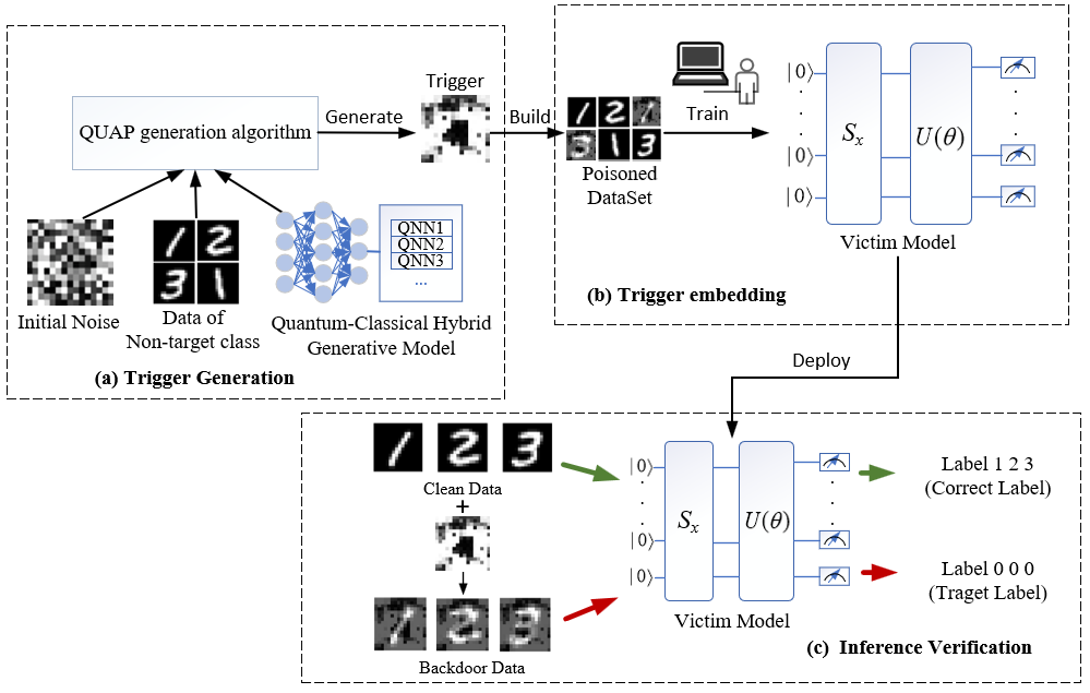 论文针对量子神经网络的安全性问题,提出了一种基于量子-经典混合生成模型的黑盒后门攻击方法。该方法通过生成具有目标特征的通用对抗扰动(QUAP)作为后门触发器,并设计了一个基于集成模型思想的“量子神经网络池”(QNNP),结合最小-最大框架和非目标KL散度技术,提高了触发器在未知结构QNN模型中的可迁移性,从而实现了对量子神经网络的黑盒后门攻击。实验结果表明,在仅5%的数据污染率下,该方法在三种不同结构的QNN上均取得了超过98%的攻击成功率,同时几乎不影响干净数据的检测精度,展现出良好的隐蔽性和攻击效果。此外,论文还验证了现有主流后门检测手段难以有效防御所提出的攻击方式。这一研究为未来量子机器学习安全性的防护机制设计提供了重要的理论参考和技术启示。