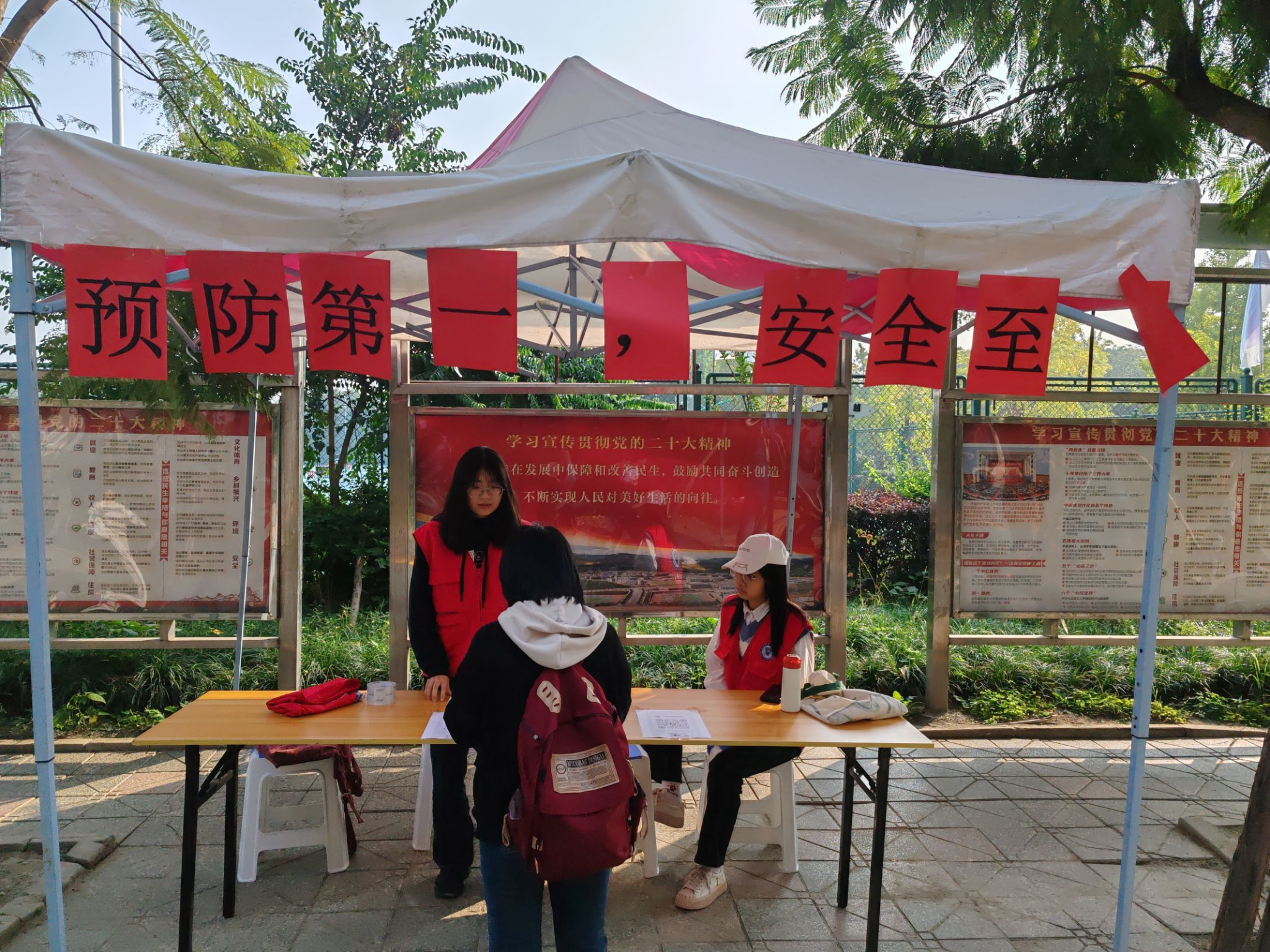 准备线上答题的环节,并精心准备精美礼品。同时在线下,志愿者发放传单后,邀请同学们同消防标语合影留恋。