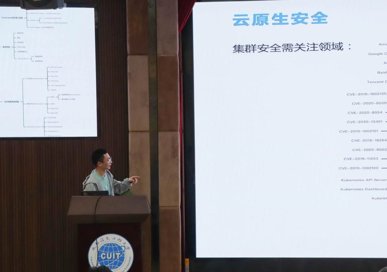 第三位演讲嘉宾是百度安全高级安全工程师张金豪,他为同学们分享主题是“未知攻焉知防-云安全那些事”,从甲方安全运营介绍到云原生安全发展、云原生安全基础到云上安全配置,用庞大的知识储备、丰富的实战经验为在校大学生指明方向。