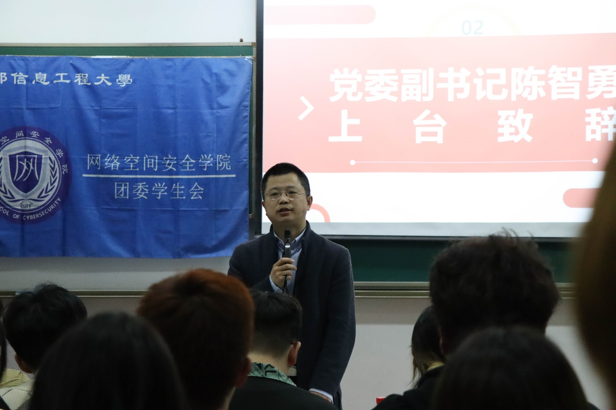 党委副书记陈智勇对新一年的团学工作提出工作要求并进行展望。首先,深刻体会校训深层内涵并不断内化为自身素养,做到真正的成于大气,信达天下。其次,以本次审核评估为契机,做好榜样力量,努力抓好学风建设。之后,陈智勇副书记对未来团学工作提出了阶段性规划,并鼓励团学干部,努力提高自身政治素养,提升自我工作能力,各部门共同打造网安特色文化。