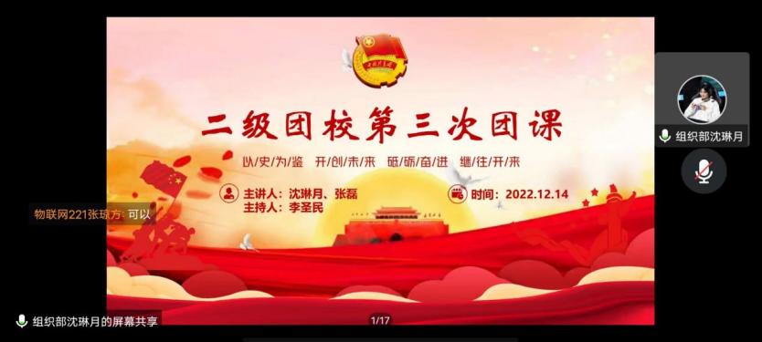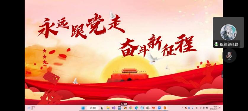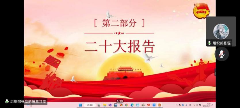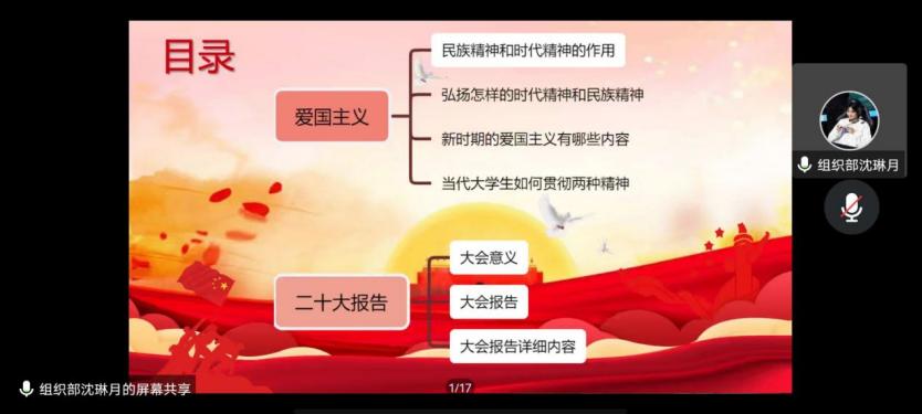 组织部于12月14日在线上开展了本次二级团校培训班的第三次团课。本次课程由组织部李圣民同学主持,内容上分为“爱国主义”和“深入学习贯彻党的二十大精神”两大板块,分别由组织部沈琳月同学和张磊同学讲解。
