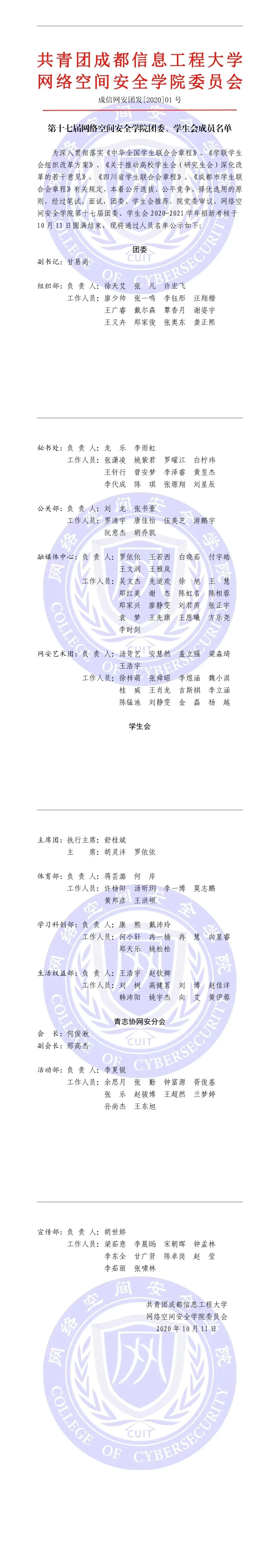 为深入贯彻落实《中华全国学生联合会章程》、《学联学生会组织改革方案》、《关于推动高校学生会(研究生会)深化改革的若干意见》、《四川省学生联合会章程》、《成都市学生联合会章程》有关规定,本着公开选拔、公平竞争、择优选用的原则,经过笔试、面试,团委、学生会推荐,院党委审议,泡芙短视频 第十七届团委、学生会2020-2021学年招新考核于10月11日圆满结束,现将通过人员名单公示如下: