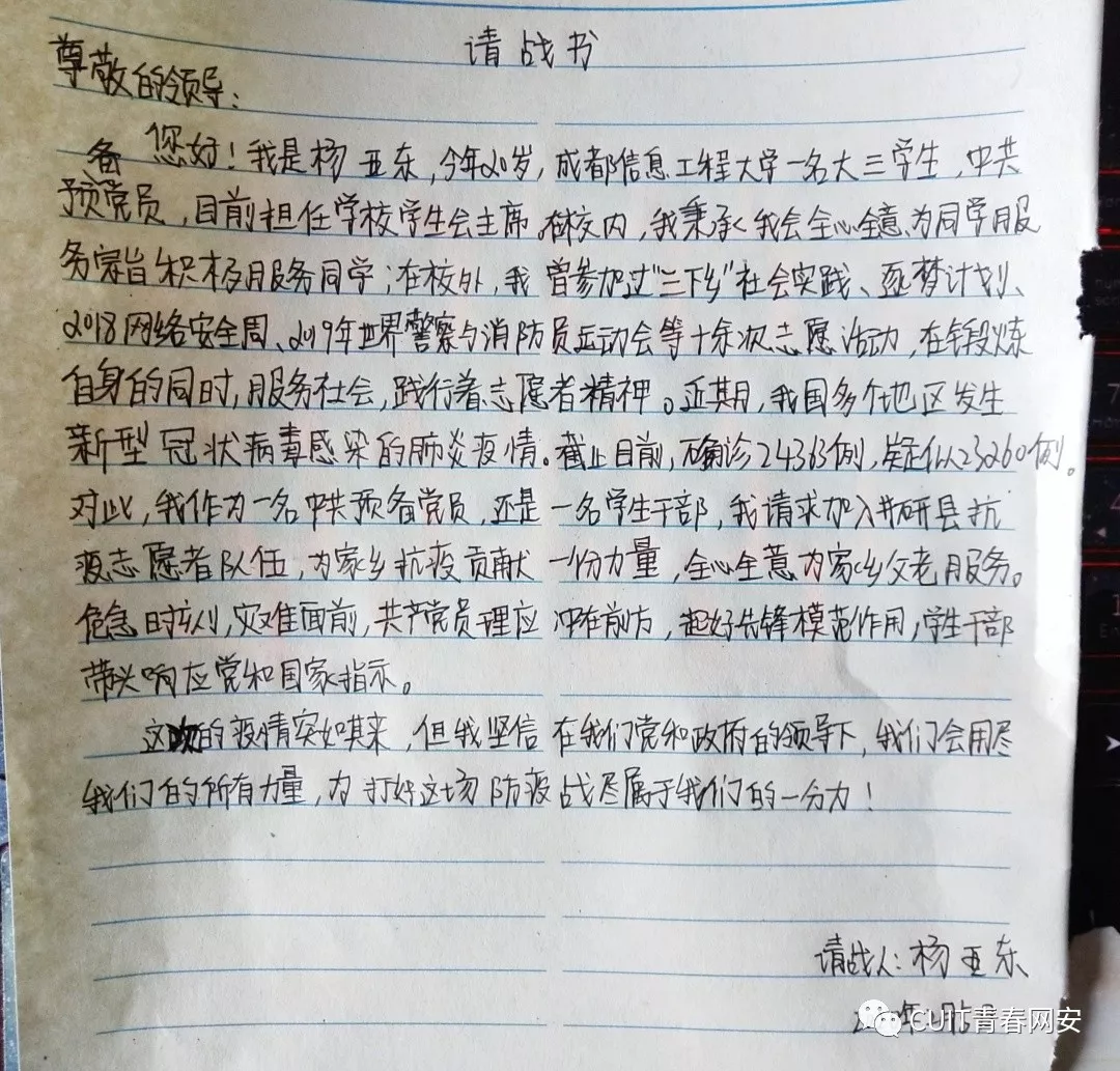 杨亚东,男,20岁,中共预备党员,现为校学生会副主席,信息安全172班班长,2018年度青春榜样“十佳班长”、“自强之星”获得者。我国多个地区发生新型冠状病毒感染的肺炎疫情后,他写下请战书,积极主动报名,成为井研县第一批防疫志愿者,为家乡父老服务。主要工作为协助四川省井研县研城镇防疫工作人员,开展秩序维护、文明劝导等工作。