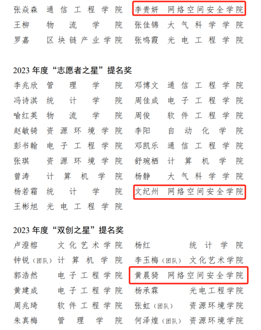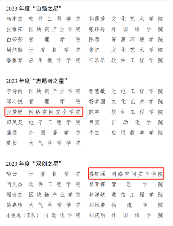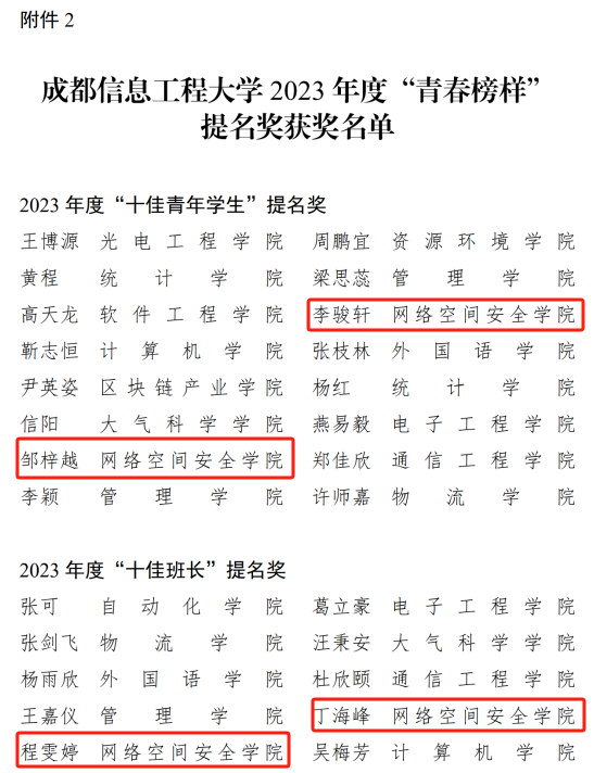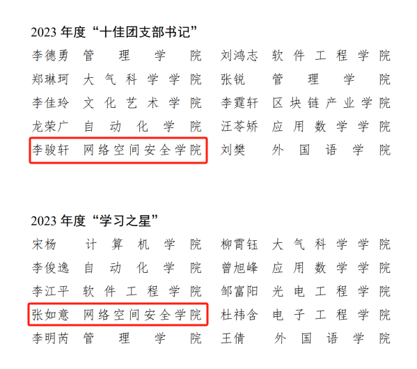 信安实验211班荣获“十佳文明(学风)班”荣誉称号;李骏轩等4名同学荣获“十佳团支部书记”、“双创之星”、“学习之星”、“志愿者之星”荣誉称号。程雯婷等11名同学荣获“青春榜样”提名奖。