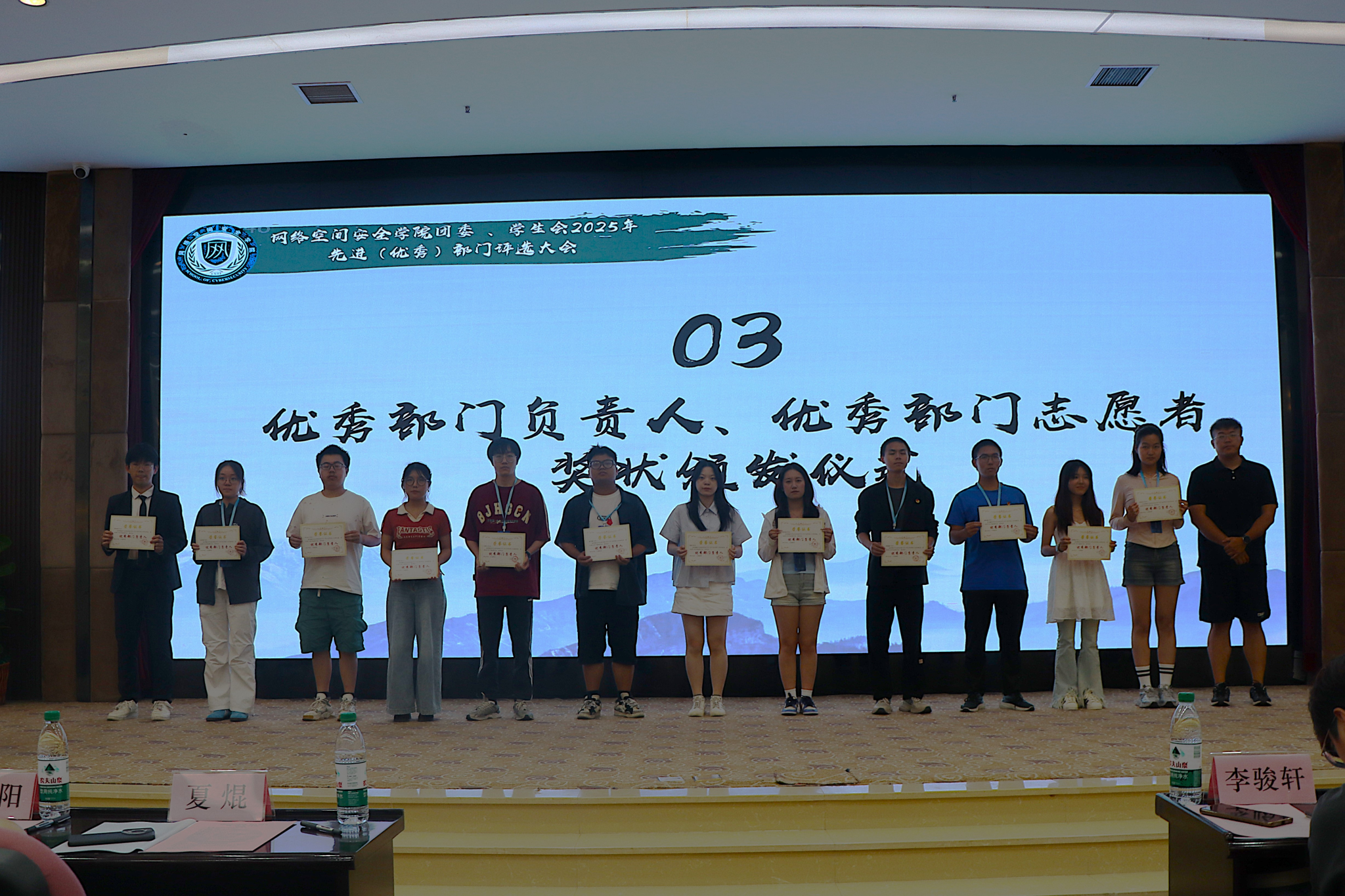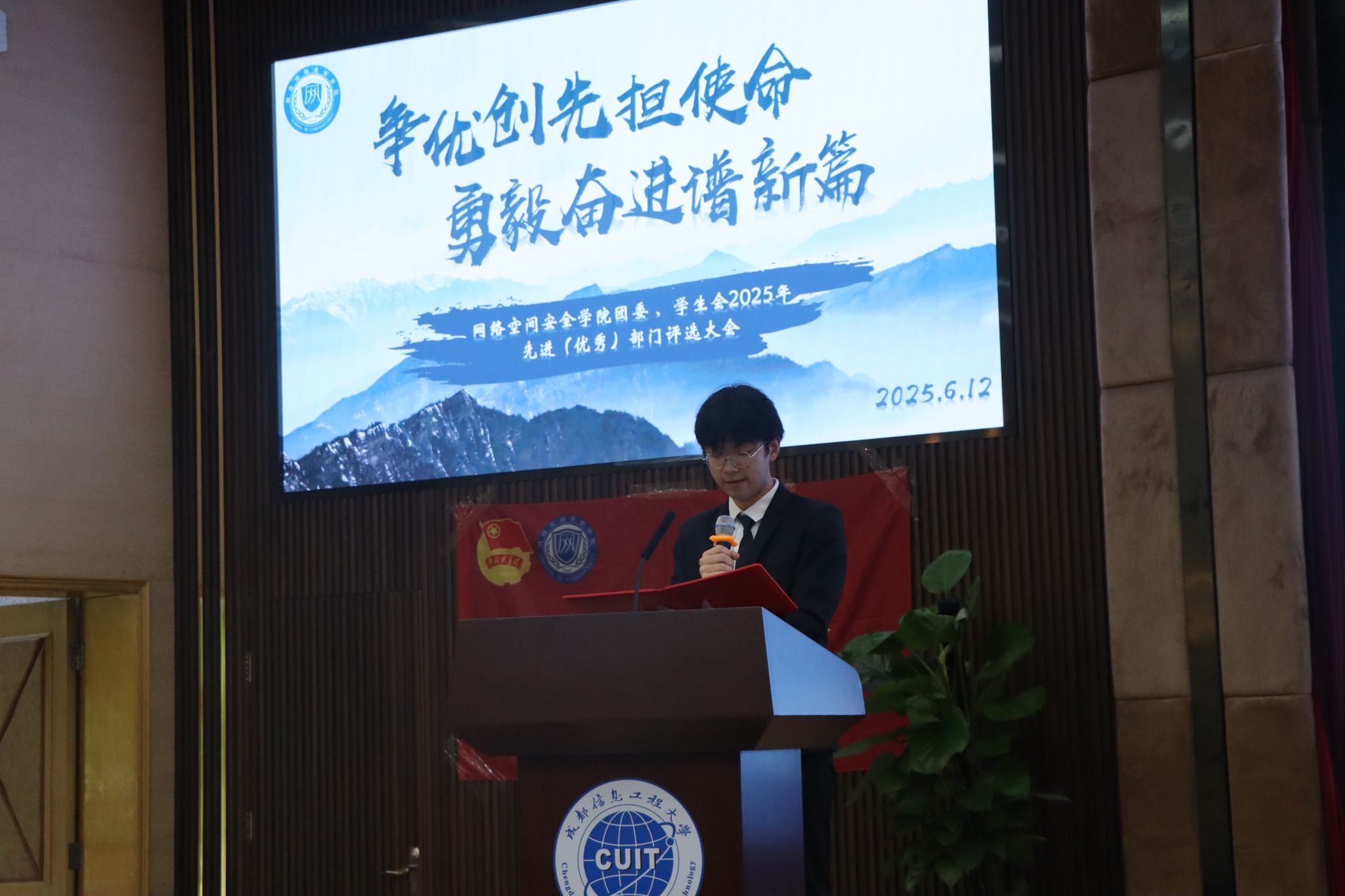 2025年6月12日下午,网络空间安全学院第二十一届团委、学生会先进集体评选大会在国际会议厅召开。学院团委书记夏焜、融媒体中心指导老师韩阳、校学生会主席廖俊、自动化学院团委副书记张恒、学院学生会副秘书长李骏轩及学院团委、学生会主席团成员出席会议。大会由学院团委秘书处陈世航主持。