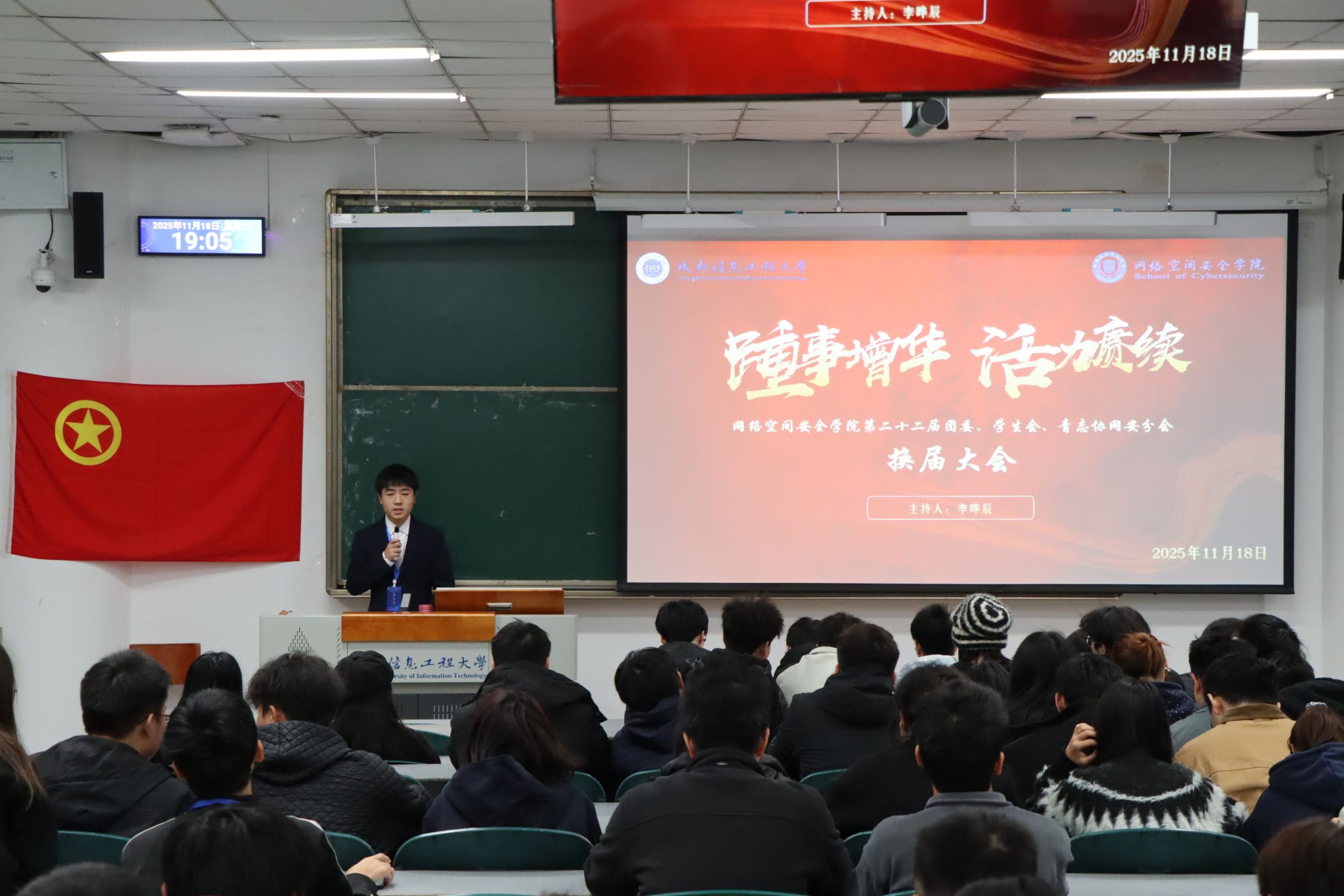 第二十二届团委、学生会、青志协网安分会换届大会在第四教学楼举行。本次大会由学院团委办公室组织筹备,李辰晔主持。学院团委书记夏焜、助管老师何媛、第二十一届团委、学生会、青志协分会主席团成员、各部门负责人以及第二十二届团委、学生会、青志协分会全体成员参加大会。