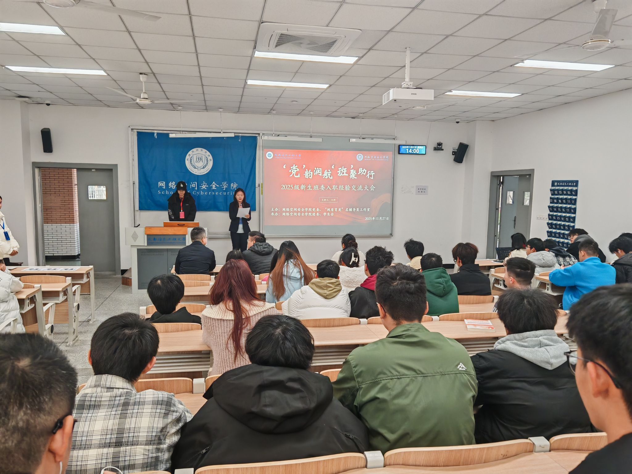 2025级新生班委经验交流大会在H1107教室举办。本次会议由学院党委、“网盾育英”名辅导员工作室主办,学院团委、学生会承办,团委办公室负责落实。学院党委副书记陈智勇,团委书记、2025级辅导员夏焜,2024级辅导员韩阳,学生代表唐亚鑫、何光济、黄睿、潘星宇以及2025级班导生和班委参会。会议由团委办公室王玥主持。