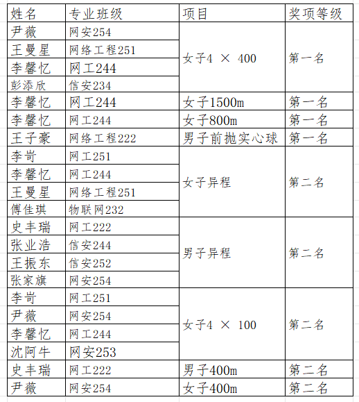 经过两天的激烈角逐,运动会在欢呼声中圆满落幕。其中,网安健儿捷报频传:李馨忆在女子1500米和女子800m项目中勇夺桂冠,王子豪斩获男子前抛实心球第一名。此外,由尹薇等四位同学组成的女子4×400米接力队配合默契,再添一金。女子异程接力、男子异程接力、女子4×100米接力、男子400米和女子400米项目中也获得了第二名的好成绩。