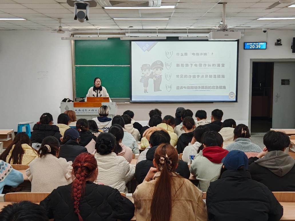 在安全教育环节,韩阳以“全民消防、生命至上——安全用火用电”为主题,结合宿舍检查情况,指出违规用电隐患,讲解安全用电规范与应急处置方法。防范电信网络诈骗部分,系统介绍了电信诈骗的定义、新形势下的演变趋势、常见诈骗手法及防范措施,并明确遭遇诈骗后的应急处理方式,提醒同学们增强防范意识,不轻信、不转账、及时求助。