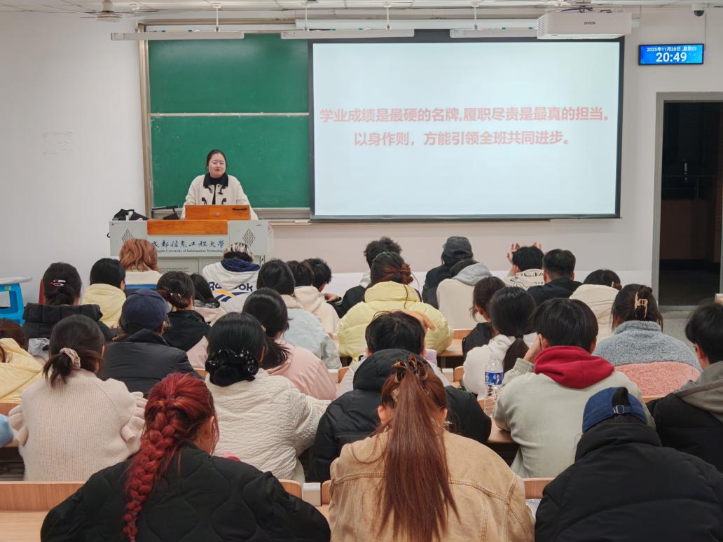 为加强班级学风建设,筑牢校园安全防线,发挥班委骨干带头作用,2025年11月20日晚20:30,2024级网络工程与网络空间安全专业学生在H2204教室召开“诚信考试、高效学习、安全护航”主题班会。会议由辅导员韩阳主持。